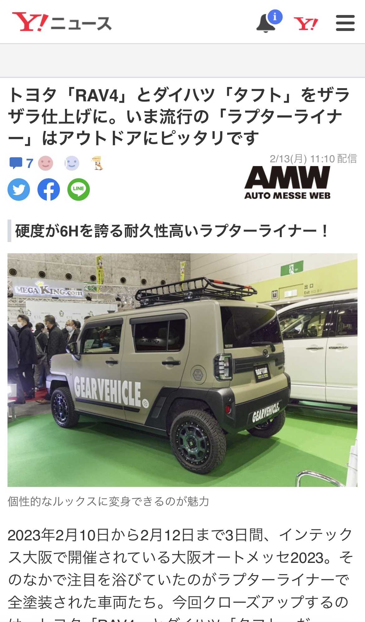 yahooニュースに取り上げて頂きました 2025 12/04 未分類 2023年2月16日2025年12月4日 未分類 よかったらシェアしてね! URLをコピーしました! URLをコピーしました! OSAKA AUTO MESSE 2023 出店しました! TOKYO AUTO SALON 2024 展示しました! この記事を書いた人 gearvehicle 関連記事 TOKYO AUTO SALON 2024 展示しました! 2024年2月29日 OSAKA AUTO MESSE 2023 出店しました! 2023年2月16日 TOKYO AUTO SALON 2023 出店決定 2022年11月7日 ラプターライナー正規取扱施工店になりました 2022年7月25日 TAFT GEAR VEHICLE 受注開始 2022年7月21日 サイトをオープンしました 2022年7月21日